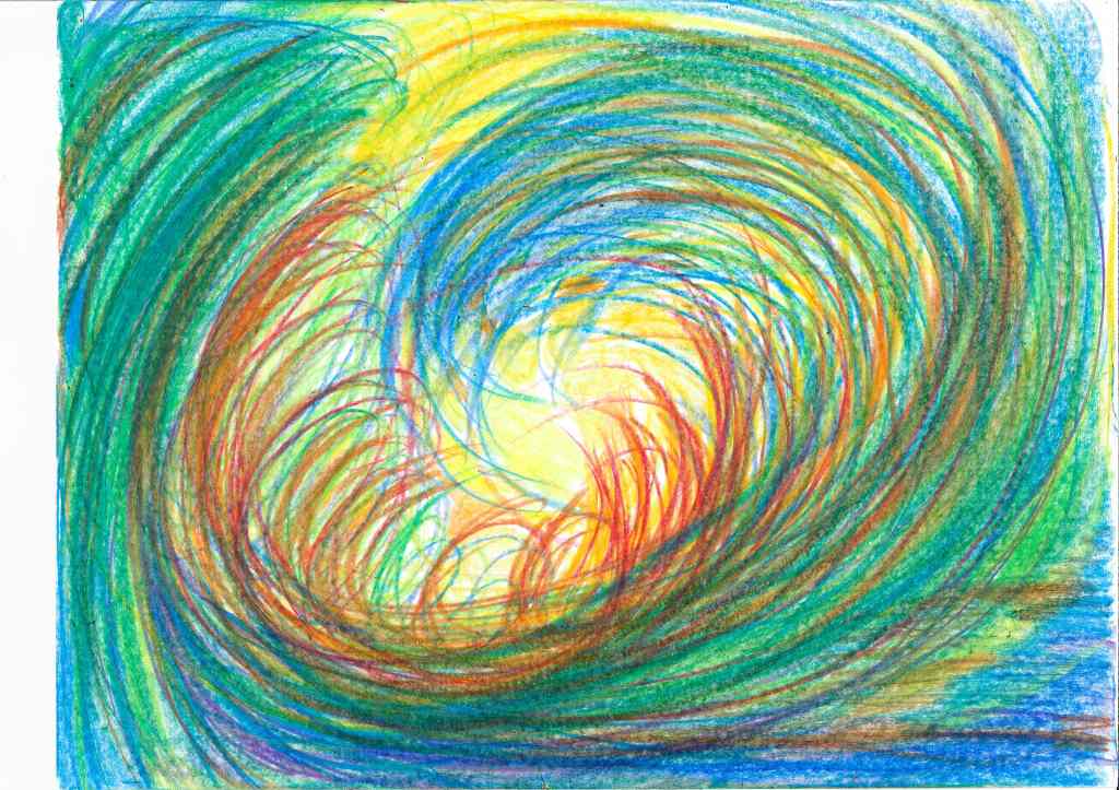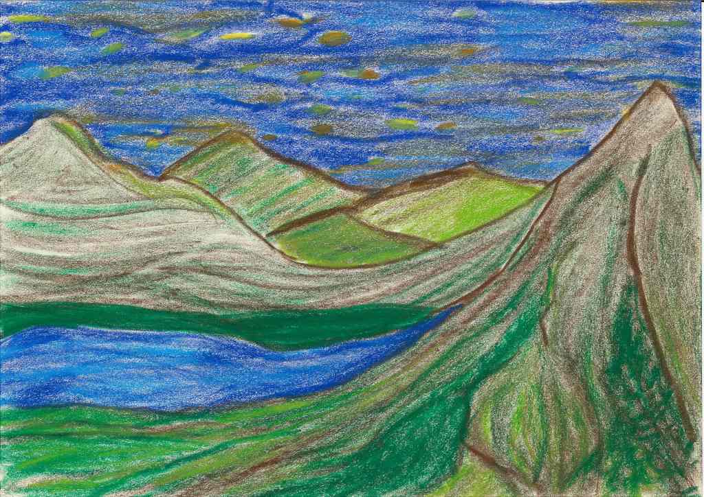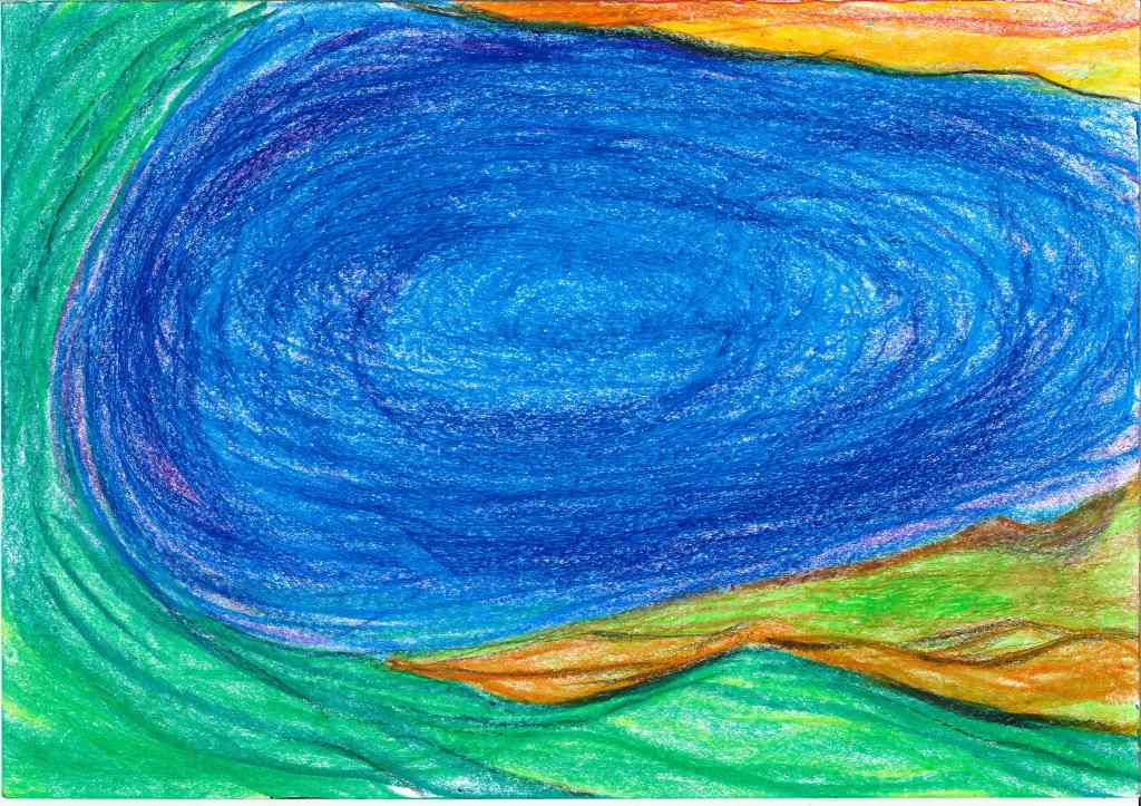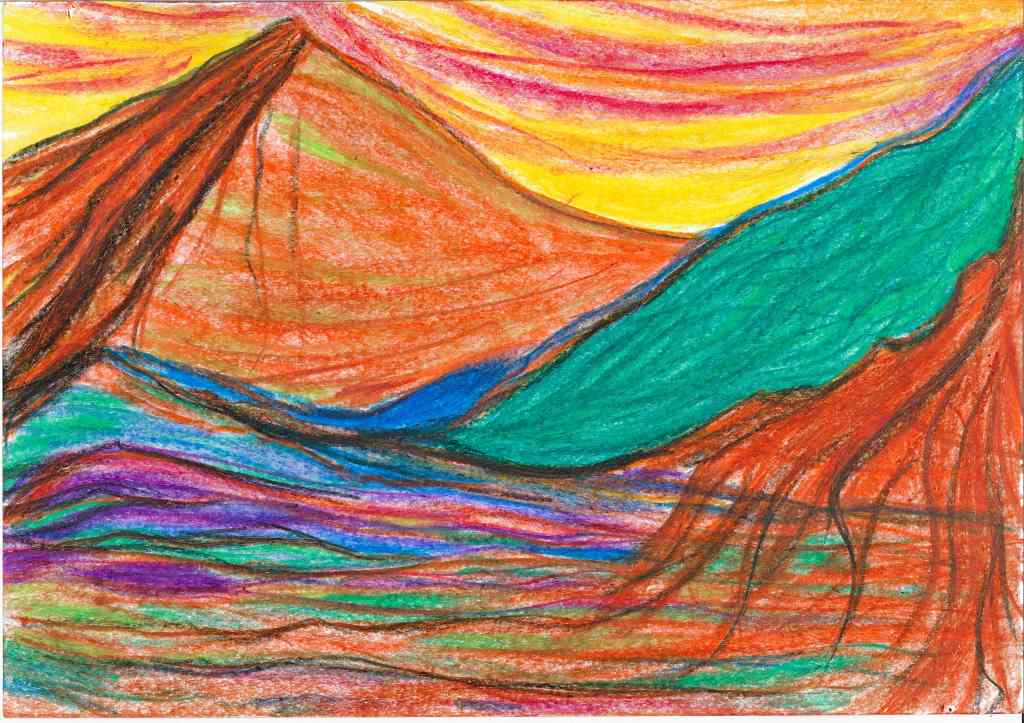 Mostly between 2022 and 2023 I have tried to translate into drawings inner movements and visions created after new moon and full moon mediation rituals. This durational piece, of which the landscape are a testimony, is part of my interest of using healing practices as creative tools. Drawing is a further development of my performance practice, where the body is the master and inspiration. Agnes Varda’s allegedly once said: if we’d open people up, we’d find landscapes”. I thought to find in me the seaside. I have found mountains, a volcano, a lake, a river, finally the sea. The idea of working with landscape has to do with the tradition in several cultures to use landscape both as contemplative theme as well as an escapist strategies of exoticism. I was also interested to work with the potentialities of what performers know as “the flow”, meaning a kind of fluid decision making that arises from the moment (or does it?) and questions the boundaries of inner and outer space, of ego and non ego. The subject is not the topic here, but rather the struggle between trying to follow the impulse and the will of form; a struggle of an ignorant artist, struggle to catch the moment, struggle to stay in it, struggle to believe, the desire of Devine (or anything similar), kitsch but somewhat real.