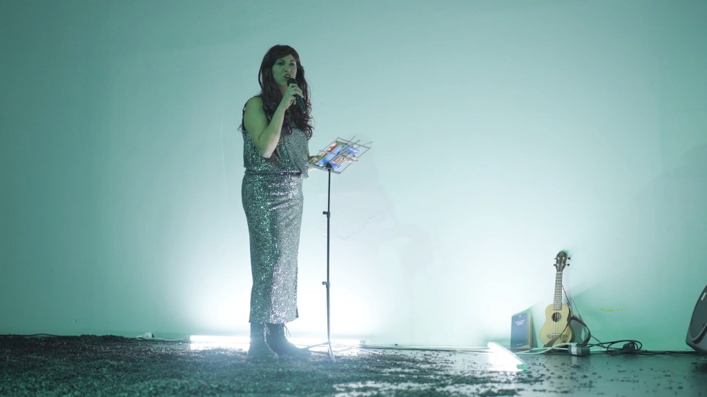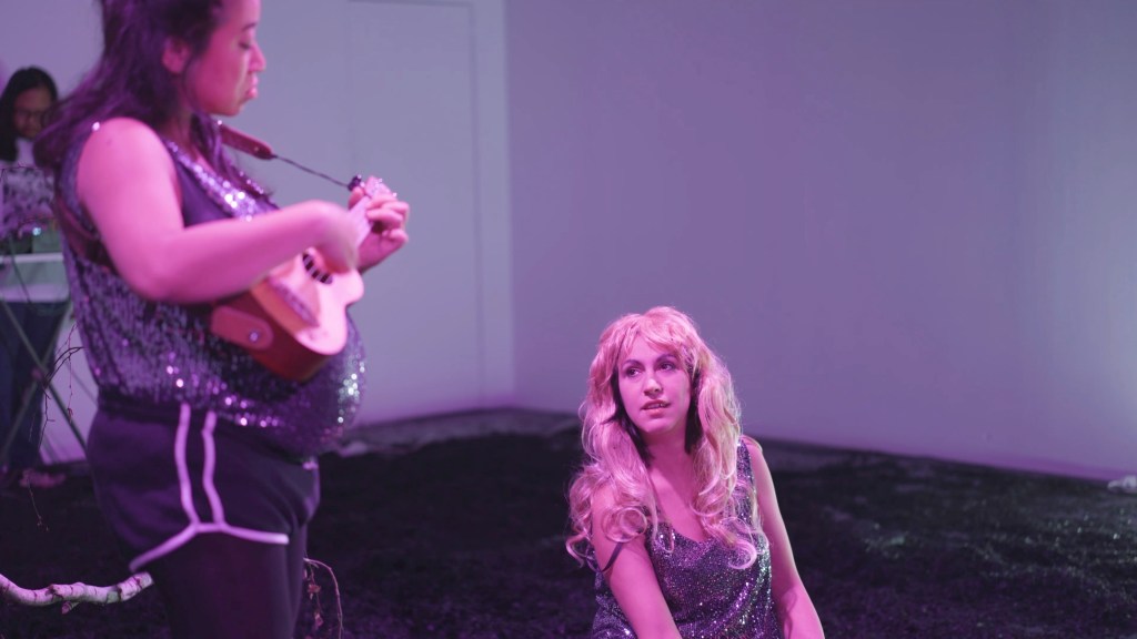“Score based study on body voice and text loosely inspired by Lust by Elfriede Jelinek, MTV, fucked up relationships, and cheap wigs. In German Language and broken English.” With Irene Accardo, Riako Napitupulu, and Ghaliz Haris, aka Callas&Dollars. Work in progress.